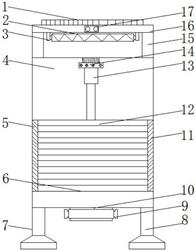本实用新型公开了一种智慧城市智能垃圾管理装置,包括箱体,所述箱体的一侧表面设置有插接导出组件,所述箱体的顶部两侧皆固定安装有支撑板,所述支撑板的顶部固定安装有顶板,所述顶板的底部两侧皆固定安装有连接块,所述连接块之间固定安装有紫外线灯管。该一种智慧城市智能垃圾管理装置,可通过电动推杆伸缩带动挤压板进行移动,对箱体内部的垃圾进行实时挤压出液体,并通过筛网将液体进行过滤导入到箱体底部,实现垃圾中的固液分离,可通过气缸带动伸缩杆进行实时伸缩,将挡料板从插接座内侧进行实时抽动,将导出口进行实时打开,通过挤压板将固体垃圾推出,使垃圾清理更加方便效率更高。