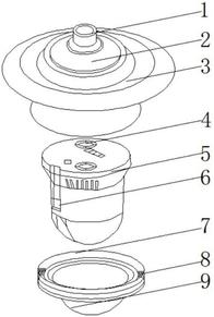 本实用新型公开了一种球形摄像机安装架,包括球体底箱,所述球体底箱的外侧表面活动套接有挡罩,所述挡罩的表面开设有连接口,所述挡罩的底部两侧固定安装有微型风机,所述微型风机通过送风管与球体底箱两侧贯穿连接,所述球体底箱内侧卡合安装有球体驱动器,所述球体底箱的底端卡接安装有下球罩。该一种球形摄像机安装架,在进行日常使用的过程中,通过挡罩对安装架整体起到保护作用,防止室外安装过程中雨水侵蚀,同时可通过微型风机向安装架内部输送气体增压,使内部压强高于外部压强,防止灰尘杂物进入到安装架内部影响器件运行,同时可将内部热量实时输送到外部,防止热量积聚导致器件老化。
