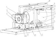 本实用新型公开了一种高速离心风机润滑散热结构,包括齿轮箱、齿轮润滑油箱、主油泵、辅助油泵、鼓风机底座、鼓风电机和风机机架,在所述风机机架的内顶端固定有散热器,在鼓风机底座的两端分别设置齿轮润滑油箱和风机机架,在齿轮箱底座上固定齿轮箱,在齿轮润滑油箱的顶端上固定相互连通的齿轮箱,在齿轮箱的低速轴上设置主油泵,在风机机架内设置鼓风电机,电机通过电机底座固定在鼓风机底座上,在电机底座的侧面的鼓风机底座上设置有油路集成块,所述齿轮润滑油箱通过主油泵与油路集成块连通,齿轮润滑油箱输出端通过辅助油泵与油路集成块连通,油路集成块通过散热器与所述齿轮箱连通。本实用新型能对润滑油散热的同时可以带走内部的热量。