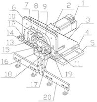 本实用新型公开了一种搬运机械手装置,属于机械手领域,包括步进电机、减速器、底座、底板、左导轨、中导轨、右导轨、臂杆、轴承、导轨安装板、u型原点开关、微型导轨、滑动装置和横向滑轨。通过设置左导轨、中导轨和右导轨构成弧形导轨,同时使用臂杆的板状结构,一端的轴承卡设置在导轨内,然后使用滑块安装板和压滑块安装板的左右移动,微型导轨上压滑块安装板上竖直移动,可以很好的完成了把旋转动作实现了拿起放下以及移动的动作,使得在搬运物体时动作的效率更高,不需要有一般机械手的各个关节弯折的动作,使得效率大大的提高。