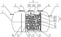 本实用新型公开了一种控制梯度溶解氧分布的复式曝气装置,属于污水处理技术领域,包括污水处理装置本体,污水处理装置本体的顶部设置有检修孔,污水处理装置本体一端设置有进水管,另一端设置有出水管,污水处理装置本体内部通过设置第一隔板、第二隔板、第三隔板把污水处理装置本体内部分隔为缺氧区、厌氧区和曝气区,曝气区填装有纳米改性柔性填料,曝气区的侧边上设有微孔曝气进气管和穿孔进气管。本实用新型通过穿孔管和微孔曝气管相结合的复式曝气方法,可确保传质充分、充氧效率高、脱氮效果好,而且纳米改性柔性填料具有发达的孔隙结构,从表面向内部逐步形成一个溶解氧梯度,实现短程同步硝化与反硝化,提高系统的脱氮效率,确保出水稳定达标。