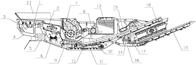 本实用新型公开了一种破碎筛分一体机,属于石料破碎装置领域,包括给料机、预筛分装置、液压翻盖料仓、骨架、液压系统、预筛接料输送带、破碎机、电动机、破碎机底部送料机、主送带、履带行走装置、油电动力系统、第一过度带、除铁器、可升降前臂、第二过渡带、返料筛、成品带、侧边带和返料带。该一体机具有工作效率高,使用寿命长,适合野外工作,可以提高经济效益和加快工期的优点。