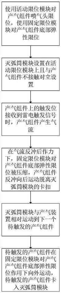 本发明公开了一种利用反冲力的伸缩性灭弧组件切换方法,属于输电线路防雷保护装置领域,当触发位上的产气组件接收到雷电触发信号时,产气组件外壳爆裂,产生灭弧强气流。产气组件在强气流的反冲后作力下,触发位上的产气组件脱扣,灭弧转盘在转轴的作用下转动。待触发位上的产气组件转动到触发位上时,产气组件一端部分伸入灭弧筒内,再次实现卡位,产气组件金属外壳与金属电极接触后触发回路连通,等待下一次触发信号。本发明提高了灭弧产气组件切换的有效性和可靠性,避免了灭弧转盘转动时发生卡壳问题,触发位上的产气组件一端部分伸入灭弧筒内,对触发时产生的强气流有较强的密封作用,使强气流最大化作用在电弧,提高了灭弧能力。