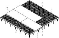 本实用新型公开了一种干式工法架空装饰组件,包括支撑框本体,该支撑框本体由内支撑框架以及一个或多个相互扣接连接在一起的边框支架组成,在每个边框支架内浇注所述内支撑框架,从而使内支撑框架与内支撑框架一体成型,该内支撑框架呈蜂窝状且向下凸出浇注在边框支架所包围的区域内,所述内支撑框架上表面与所述边框支架的上表面在同一平水平面内,在所述边框支架的底面边缘周围和内支撑框架的底面上分别设置有支撑螺杆。本实用新型能实现快速地安装,安装方便,而且性能稳固,并进行快速调平件实现整平,提高了架空装饰组件安装铺设的速度和效率,也降低了架空装饰组件下方安装的水管或电线管检修的难度。