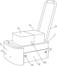 本实用新型公开了一种室内装修灰尘收集装置,涉及到家用灰尘清洁领域,包括底座,底座上表面设置凹槽,凹槽上表面一侧设置有推杆,底座远离推杆的侧面设置有防护结构,底座底面设置有清理结构,吸尘探头的一侧设置有连接块,连接块转动连接拖布,在装置工作时,打开水泵开关,水泵工作,高压喷头对地面上的灰尘洒水,降低灰尘漂浮的可能性,同时配合第一挡板和第二挡板对因装置工作时造成的灰尘漂浮的固定在第一挡板和第二挡板之间,减少了灰尘四处漂浮的概率,清理结构通过毛刷将灰尘堆积,方便吸尘探头将其吸走,同时拖布对未被吸走的灰尘进行拖洗,极大程度上提高了装置对地面灰尘的清理效率和清理程度,节约了人工。