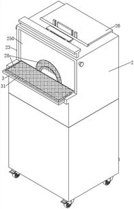 本实用新型涉及洗头护理领域,具体地说,涉及新型床上洗头护理车。其包括储水箱和废水箱,储水箱和废水箱顶部卡接设有护理箱,护理箱内壁位于底部中间处设有储药槽,护理箱外壁位于顶部靠近L型缺口开设有长条孔,长条孔内部滑动设有压板。本实用新型中将护理车推到患者的床头处,将患者的头部伸入到护理箱内部,将颈部放置在枕板上,调节压板,使半圆缺口按压在人们的额头上,此时人们的面部位于护理箱的外部,带有头发的部位位于护理箱内部,洗护时有利于避免洗头时的水溅出来弄湿床褥和衣服,将熏蒸药物放置在储药槽内部,关闭L型密封盖,使患者的头皮部位在护理箱内处于一个密封的环境,可以其头部进行熏蒸洗护治疗。