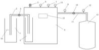 本发明公开了一种关于胶凝材料碳吸收反应装置,属于建筑材料检测技术领域,包括外部水存储器、内部水存储器、碳吸收箱、二氧化碳存储罐和二氧化碳检测仪表,外部水存储器设置连通水管与内部水存储器连通,连通水管上设置有水管开关,内部水存储器设置在碳吸收箱内,外部水存储器放入水并淹没连通水管的一端,二氧化碳存储罐通过设置二氧化碳通管与碳吸收箱连通,二氧化碳通管上设置有二氧化碳开关,碳吸收箱上设置有通气阀,内部水存储器与碳吸收箱的内部连通,碳吸收箱内放置胶凝材料。该设备简单,操作过程便捷,计算碳吸收量准确,同时设置外部温湿度和水位差等的造成的压力差进行微调最后的测算二氧化碳的体积量,使得更加的精准。