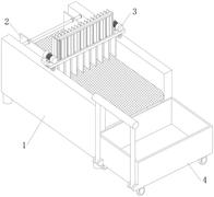 本实用新型公开了一种可调尺寸的面包切片装置,涉及食品加工技术领域。本实用新型包括支撑架、固定组件、宽切割刀和收料车,撑架内侧插接有传送带,支撑架内侧位于传送带下端设置有收渣箱,支撑架内侧卡接有两个固定组件,固定组件表面贯穿插接有第一步进轨道和第二步进轨道,支撑架上侧通过震动弹簧弹性连接有宽切割刀,宽切割刀内侧卡接有中切割刀和细切割刀,支撑架前端贴合有收料车。本实用新型通过支撑架、固定组件、宽切割刀和收料车,解决了现有的面包切片装置不具有面包尺寸的调节功能,通过人手固定面包费时费力,容易造成误伤,产生的面包屑较难打理,不具有收料结构的问题。