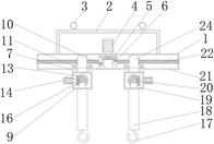 本实用新型公开了一种建筑材料吊运结构,涉及建筑工具技术领域,包括从上到下依次连接的吊运架、纵向传动箱和横向传动室和吊运架,纵向传动箱上设有第一移动块活动槽、加强块活动槽、纵向传动室支撑块、纵向丝杆、伺服电机、活动块、斜齿轮;横向传动室上设有第二移动块活动槽、横向丝杆、横向传动室支撑块、吊钩连接块、加强块、吊钩、滚轮、斜齿轮等。本实用新型通过吊钩、吊钩连接销的配合使用,利用纵向丝杆、活动块增大横向传动室支撑块、吊钩之间的纵向距离,解决了杆状建筑材料吊运时失衡的问题,利用横向丝杆缩小横向传动室支撑块、吊钩之间的横向距离,对吊装的杆状材料进行挤压固定,提高了该建筑材料吊运结构的稳定性和安全性。