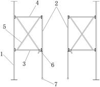本实用新型公开了一种袋装水泥装车机降尘防坠门式挡板装置,该装置包括位于两组互相镜像对称且间隔一定距离的挡板组件,两组挡板组件之间设有一定距离,所述挡板组件包括立柱、挡板、杠杆一、杠杆二、斜撑架和限位装置,所述立柱有两根且并排直立设置,每根立柱都设有杠杆一和杠杆二,所述杠杆一和杠杆二的一端通过合页固定在立柱上并间隔一定的距离,该杠杆一和杠杆二的另一端通过合页固定在挡板上,所述斜撑架的上端固定在杠杆一且下端固定在同一根立柱上连接的杠杆二,所述限位装置固定在杠杆二与挡板连接处。本实用新型能够覆盖粉尘排放区域,及装车工作业区,防止装车工人从车上坠落。