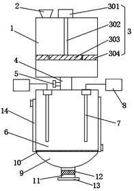 本实用新型涉及一种中药超声提取装置,包括药材粉碎机和提取罐,药材粉碎机包括机体、进药漏斗及粉碎装置,进药漏斗设置在机体的上端,粉碎装置包括电机、转动轴、粉碎刀头及环形磨圈,电机设置在机体的上端中部,转动轴一端与电机连接,另一端与转动轴连接,粉碎刀头设置于机体内,并固定套设于转动轴上,粉碎刀头外周设有环形磨圈,该环形磨圈内周设有磨齿,该磨齿配合粉碎刀头粉碎磨切,环形磨圈固定设置在机体内;机体的下端通过药物通道管连接提取罐,提取罐包括罐体,罐体内部设置有超声波发生体,罐体的底部设置有出液管。本实用新型在提取前先对中药材进行粉碎预处理,研磨效率高,再在提取罐内进行超声提取,提取效率高,提取时间短。