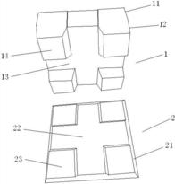 本实用新型公开了一种脚砖,包括脚砖和脚砖底座,所述脚砖包括脚砖上部和脚砖下部,所述脚砖上部位于脚砖下部的上方并呈一体式结构,所述脚砖上部为方体结构且上表面设有十字架排水槽,所述脚砖下部的四周边缘由上往下逐渐向内缩小呈倒梯形台结构,所述脚砖下部的底部中间设有十字架凹槽,所述脚砖底座包括底座本体和十字架凸台,所述底座本体的为与脚砖上部的上表面大小一致的方体,所述十字架凸台设在底座本体上方,所述十字架凸台的高度小于十字架凹槽的深度,所述脚砖置于脚砖底座上方并在十字架凹槽处形成储水槽。本实用新型的脚砖可以排水存水,结构简单,安装方便。