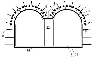 本发明提供了一种具有维修车道的合流调蓄型深层双洞隧道及其暗挖建造方法,双马蹄形深层隧道舱壁为双马蹄形截面;横断面的整体布置与空间布局是对称的;两侧分别为雨水分舱和污水分舱;雨水分舱和污水分舱内分别设置水舱墩台,在相邻两水舱墩台的两侧设置底部人行检修通道;类矩形雨水管道、类矩形污水管道均为类矩形。本发明的有益效果是雨水和污水的有效分离,最大程度防止水体污染,保证高效、可靠、安全的维修体系和维修空间,提高空间利用率。