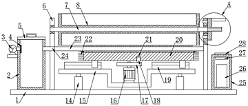 本发明公开了一种具有自动清理功能的牲畜喂食槽,包括底座,底座顶部左支板和右支板之间转动连接有转轴,转轴上固定安装有食槽,食槽顶部和底部对称设置有矩形槽口;底座顶部固定设置有左右两个电动推杆,电动推杆顶端推杆固定连接有升降板,升降板顶部左右两侧对称设置有滑轨,滑轨上方通过滑块滑动连接有移动块,移动块顶壁和侧壁均匀覆盖有刷毛;移动块底部中间位置开设有条形槽,升降板顶部中间位置固定连接有减速电机,减速电机顶端电机轴固定连接有圆盘,圆盘顶部右侧固定连接有销轴。本发明清理时还有一个槽口可以使用,方便牲畜进食;通过圆盘转动使得刷毛的左右移动对食槽底部槽口内壁进行清理,清理自动进行,效率高。