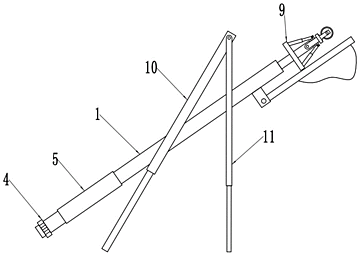 本发明涉及粉刷装置技术领域,具体是一种手持式省力型涂料粉刷装置,包括粉刷杆、滑杆和粉刷机构;所述粉刷杆的内部转动安装有螺杆,所述滑杆滑动安装在粉刷杆的内部,且滑杆与螺杆螺纹连接,所述粉刷机构安装在滑杆的另一端;所述粉刷杆的前后两侧对称设置有两根第一支架,第一支架的外侧转动安装有第二支架,所述第一支架的内侧开设有滑槽,滑槽的内部滑动安装有滑块,滑块与粉刷杆转动连接。本发明通过在粉刷杆上转动第一支架,并在第一支架上转动第二支架,使第一支架、第二支架与地面形成一个三角形的支撑架对粉刷杆进行支撑,从而将粉刷杆与手部的压力转移到对支撑架的压力,缓解了使用者的手部疲劳。