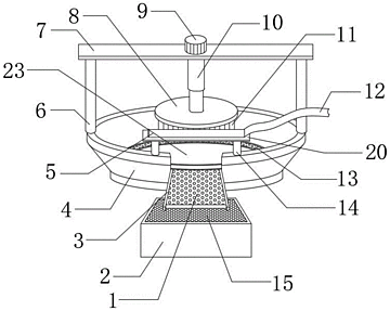 本发明属于山猪养殖技术领域,尤其是一种山猪养殖用泥浴装置,针对现有的跑山猪没有自然的泥潭进行泥浴除虫的问题,现提出以下方案,包括池体,所述池体底部的中央内壁开设有泥槽,所述池体的顶部两侧外壁均固定安装有竖直设置的第一支撑杆,且两个第一支撑杆的顶部外壁固定安装有同一个支撑顶板,所述支撑顶板的顶部中央外壁固定安装有转动电机,且转动电机的输出轴固定安装有竖直设置的第一电动伸缩杆,所述第一电动伸缩杆的底部外壁固定安装有第一支撑板。本发明中,该山猪养殖用泥浴装置,通过设置泥槽,可以在泥槽的内部放入淤泥,让山猪在淤泥里进行泥浴,以便除去山猪体表的寄生虫和蚊虫等,保证山猪的健康成长。