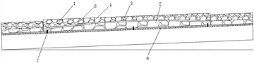 本发明公开了一种适用于长大纵坡桥面的抗剪修补结构,包括有预制上层、预制下层,预制上层底面具有梯形凹槽,预制下层顶面具有梯形凸台,预制上层底面的梯形凹槽与预制下层顶面的梯形凸台相匹配,预制下层的底面设有定位孔,桥面板上固定设置有与预制下层底面的定位孔相配合的定位柱;所述预制上层、预制下层为沥青混凝土结构,预制上层底面具有富油层,预制下层顶面具有电加热层。本发明有效防止修复后重新出现滑移的现象,前期强度高,可以快速通车,修复后表面平整,保证了行车的舒适感,修补后的桥面区域具有良好抗剪和抗变形性能。
