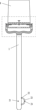 本实用新型涉及一种农用锄头,尤其涉及一种可调节角度的农用锄头。本实用新型的技术问题是:提供一种能够自由调节角度的可调节角度的农用锄头。一种可调节角度的农用锄头,包括有握杆、固定架、固定板、第一轴承座、第一转轴、调节箱、铁板、滑轨、滑块等;握杆顶部设有固定架,固定架左右两壁的顶部均设有固定板,固定板的内侧后部均匀开有凹槽,左右两方固定板的内侧中间均镶嵌式设有第一轴承座,第一轴承座上设有第一转轴。本实用新型通过设置的调节箱能够使铁板转动,从而能够适应人们劳作的需要;设置的固定杆能够将铁板固定,防止铁板随意转动;设置的弧形杆能够使本设备方便挂在墙上,从而达到不必占用地面的空间。