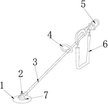 本实用新型公开了一种用于农业的除草设备,其结构包括刀片、清洁装置、长杆、把手、电机、松紧带、转机保护壳,刀片与转机保护壳活动卡合,清洁装置与转机保护壳焊接连接,长杆与转机保护壳焊接连接,把手与长杆嵌固连接,电机与长杆嵌固连接,松紧带与长杆嵌套连接,本实用新型在除草工作结束后,由连接块接入水管通过水管喷出水于刀片面上,同时启动电机转动刀片,在水流冲击加上刀片的快速旋转,使刀片能够全面的清洗到位,从而达到清理残渣的作用,防止出现手动清洗而导致的割伤,操作简单又具有自动性。