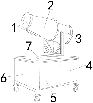 本实用新型公开了一种农业种植用喷洒范围广的农药喷雾机,其结构包括保护装置、风筒、风筒电机、电控箱、水泵、水箱、加水口,保护装置嵌固置于风筒内部,风筒电机螺栓连接在风筒内部尾端,电控箱嵌固在水泵后部,水泵与水箱焊接连接,水箱嵌固在水泵前部,加水口铆合在水箱顶部,保护装置包括外罩、套管、喷水环、导风筒,外罩嵌固在套管前端,套管与喷水环嵌固连接,喷水环螺栓在导风筒出风口处,导风筒与套管螺栓连接,本实用新型一种农业种植用喷洒范围广的农药喷雾机在喷洒农药时遇到强风可将喷水环停止,通过横向喷杆上的喷射口进行平面喷洒,使风力不会将喷雾吹散,避免部分药水被风吹回,导致喷雾的回流使喷塑机身生锈损坏。