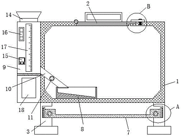 本实用新型为一种鸭鹅养殖笼,包括养殖笼,所述养殖笼的顶部转动铰接有笼门,所述养殖笼上设置有用于对笼门进行固定的锁紧组件,所述养殖笼的底部固定安装有对称设置的两个支腿,且两个支腿相互靠近的一侧固定卡装有同一个托盘,所述养殖笼的底部内壁上设置有喂料皿,所述养殖笼的一侧固定安装有盛料箱,所述盛料箱内设置有饲料,所述盛料箱的一侧固定安装有相连通的连接管,且连接管的一端延伸至喂料皿的上方,所述连接管上固定安装有驱动电机,所述驱动电机的输出轴延伸至连接管内并固定安装有转动轴;本实用新型的养殖笼功能丰富,不仅可以利用养殖笼对鸭鹅进行圈养,而且还可以对其进行定时投料,达到了对鸭鹅进行科学养殖的目的。